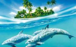 Океан, вода, дельфины, волна, остров, пальмы