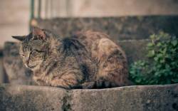 Кот, ступеньки, камни, куст