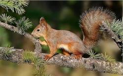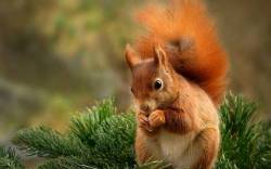 Белочка, на еловой ветке, грызет орешек